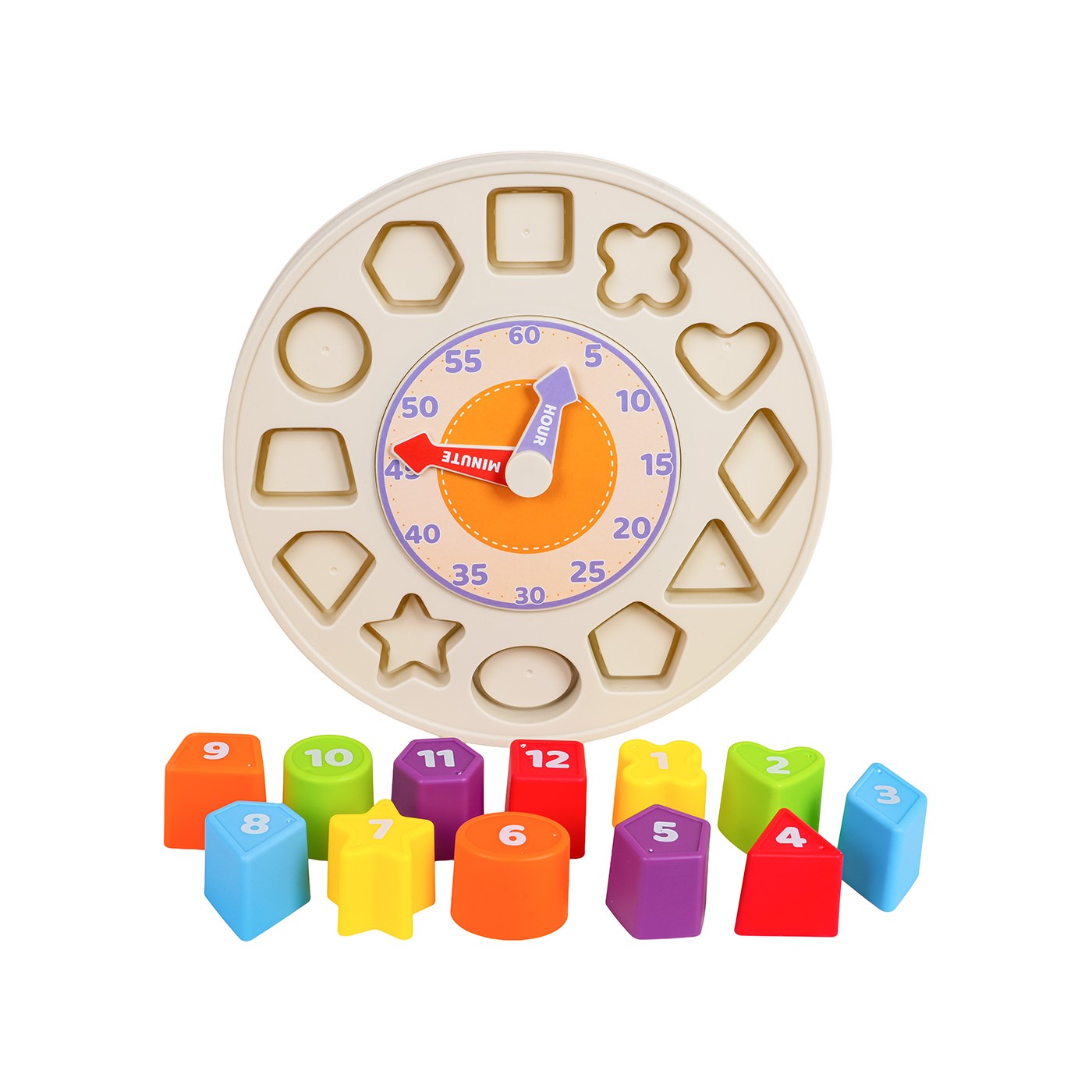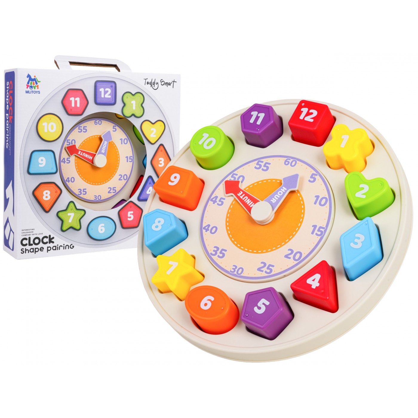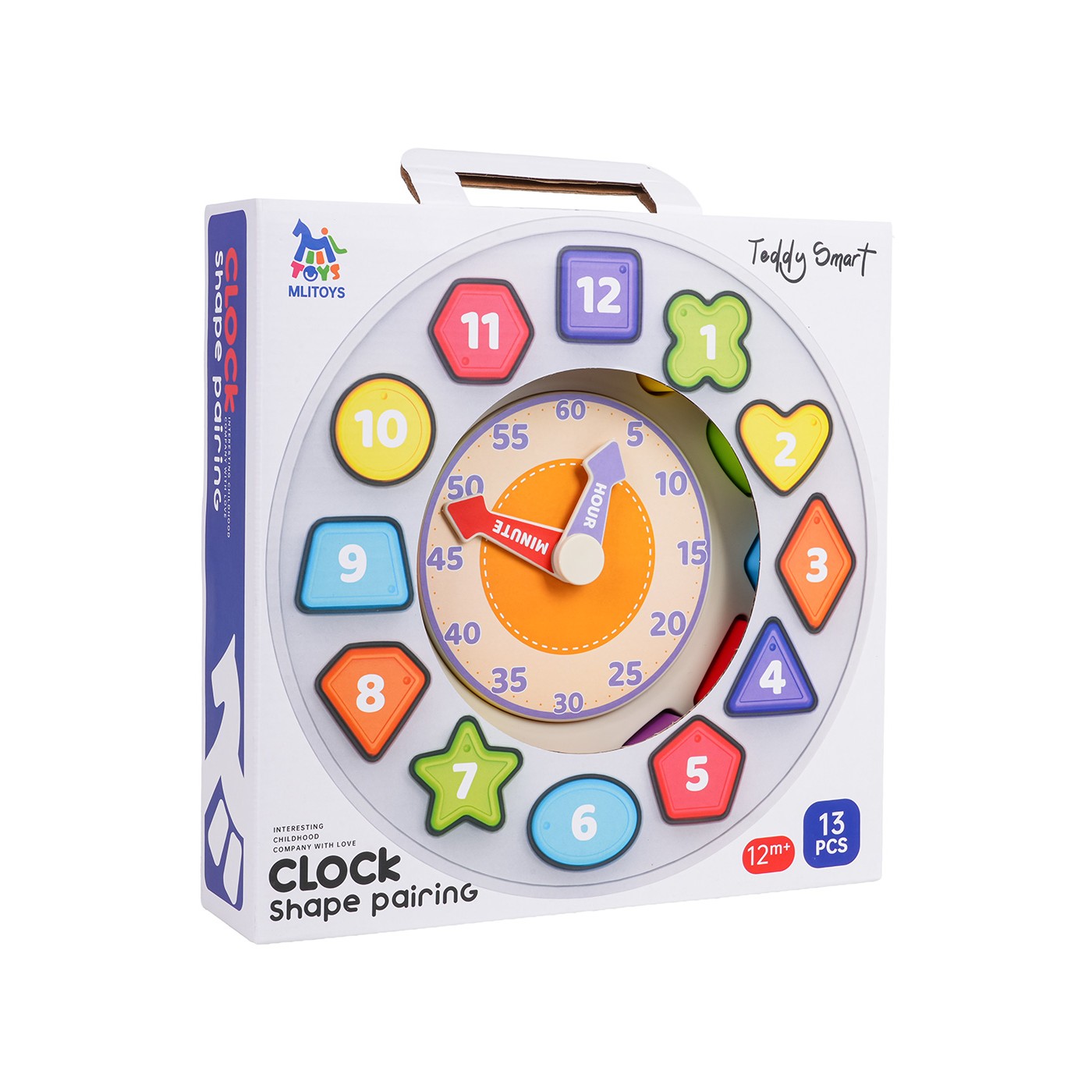 Dziecko może dopasowywać kształty, ćwicząc precyzję i spostrzegawczość, a ruchome wskazówki umożliwiają zabawę w ustawianie godzin. Z tyłu zabawki umieszczono zawieszkę, dzięki której zegar może być również elementem dekoracyjnym na ścianie w pokoju dziecka.