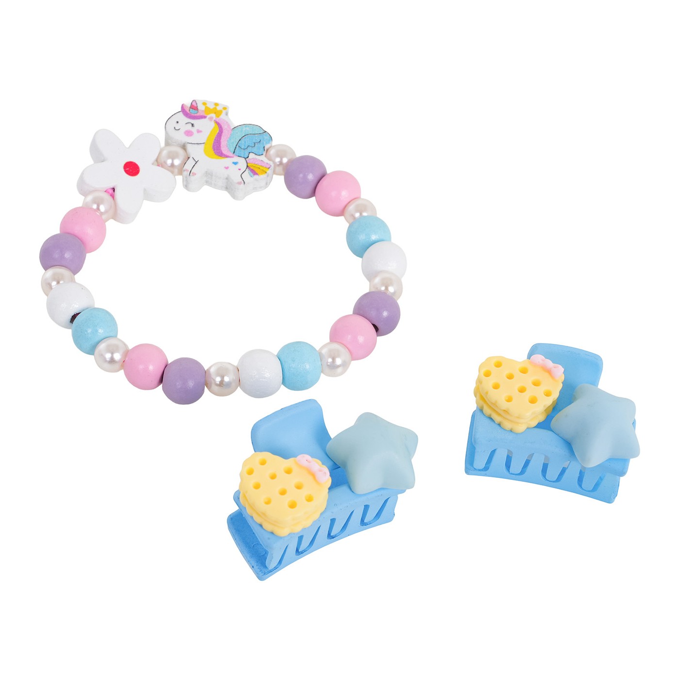 W zestawie znajduje się kolorowa bransoletka wykonana z różnokolorowych drewnianych koralików i perełek oraz dwie spinki ozdobne. Wszystkie elementy zostały zaprojektowane z myślą o najmłodszych – są lekkie, wygodne i pozbawione ostrych krawędzi. Materiały użyte do produkcji są bezpieczne dla dzieci, a żywe kolory zachęcają do samodzielnego zakładania i eksperymentowania ze stylem.