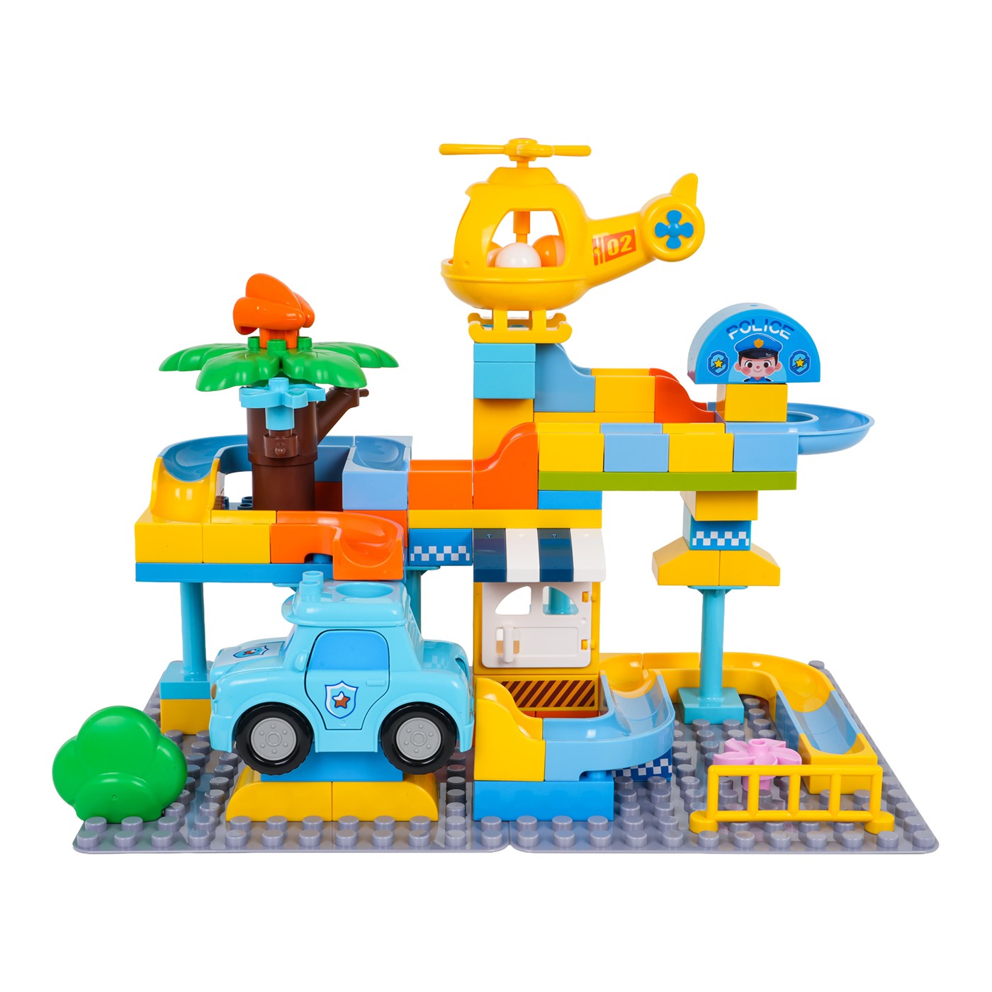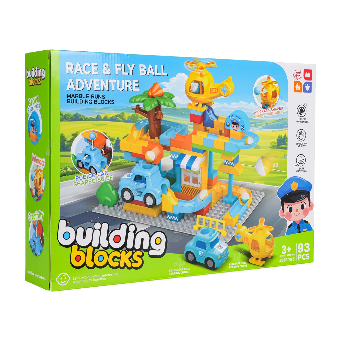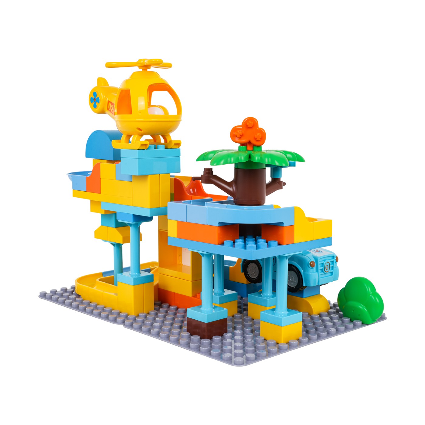 Zestaw składa się z 93 dużych, trwałych klocków wykonanych z wysokiej jakości tworzywa. Elementy mają wyraziste kolory i są łatwe do chwytania przez małe rączki. Samochód i helikopter zostały wyposażone w specjalne otwory, przez które mogą przelatywać piłeczki, co wprowadza dodatkowy wymiar interaktywnej zabawy. Dzięki przemyślanej konstrukcji, budowle są stabilne, a poszczególne części można ze sobą dowolnie łączyć i rozbudowywać według własnych pomysłów.