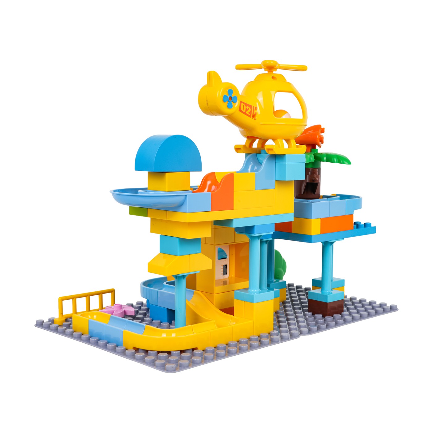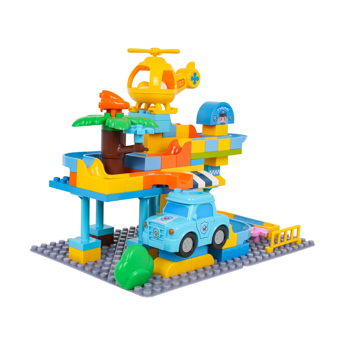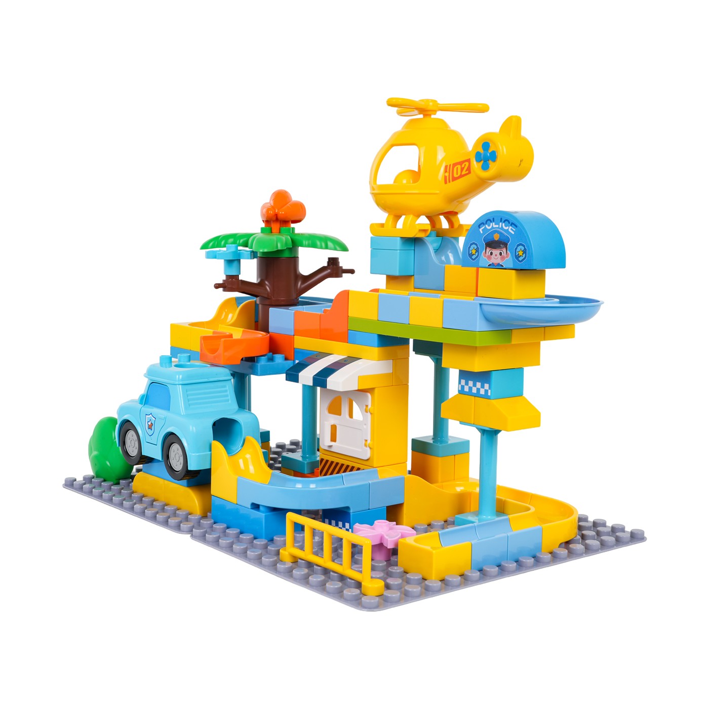 Zestaw składa się z 93 dużych, trwałych klocków wykonanych z wysokiej jakości tworzywa. Elementy mają wyraziste kolory i są łatwe do chwytania przez małe rączki. Samochód i helikopter zostały wyposażone w specjalne otwory, przez które mogą przelatywać piłeczki, co wprowadza dodatkowy wymiar interaktywnej zabawy. Dzięki przemyślanej konstrukcji, budowle są stabilne, a poszczególne części można ze sobą dowolnie łączyć i rozbudowywać według własnych pomysłów.