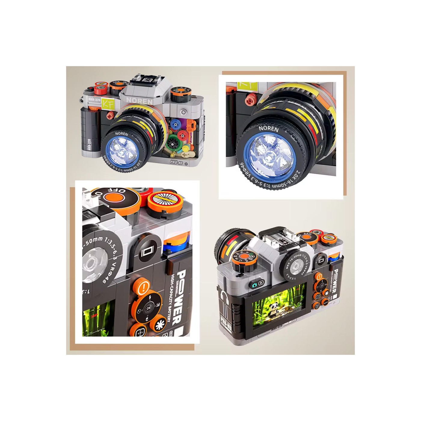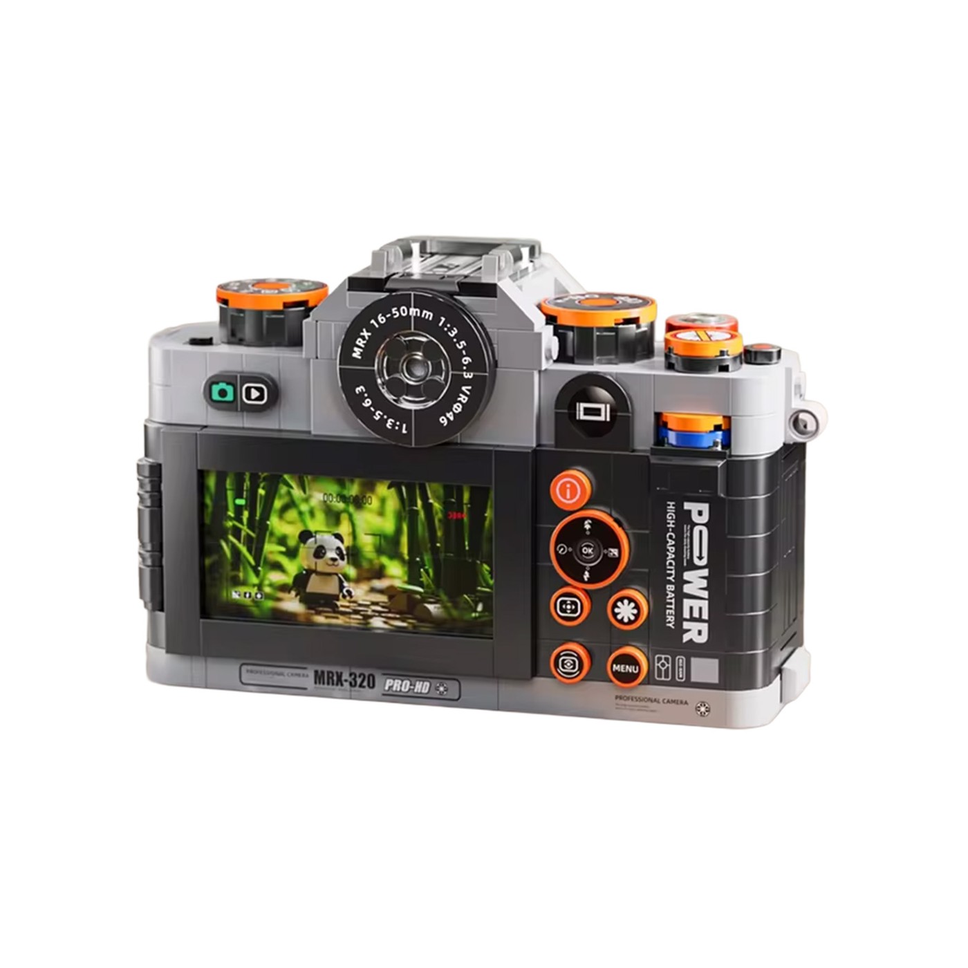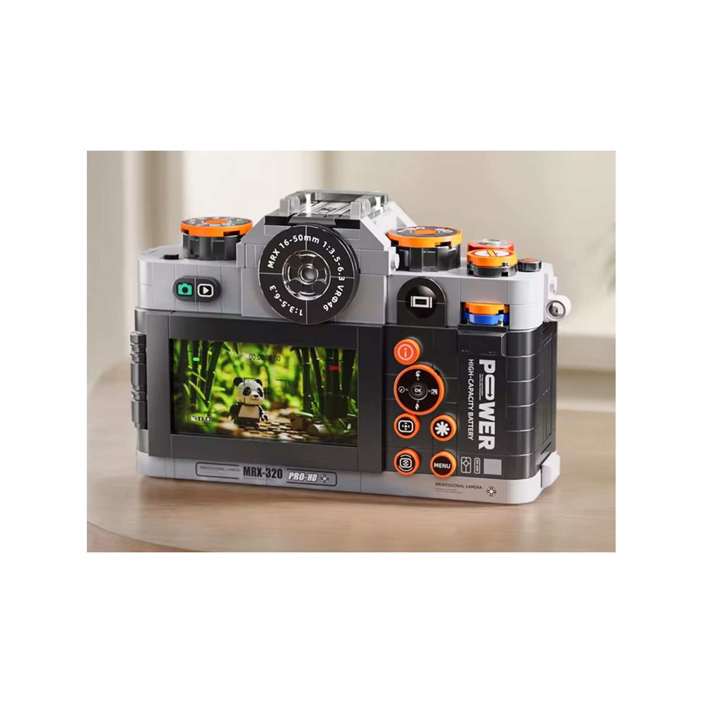 Ruchomy obiektyw stanowi ciekawe urozmaicenie konstrukcji, dzięki czemu aparat nie tylko wygląda realistycznie, ale oferuje również dodatkową funkcję mechaniczną. Całość zaprojektowano z myślą o stabilności, a także możliwości wielokrotnego składania i przechowywania bez utraty jakości.