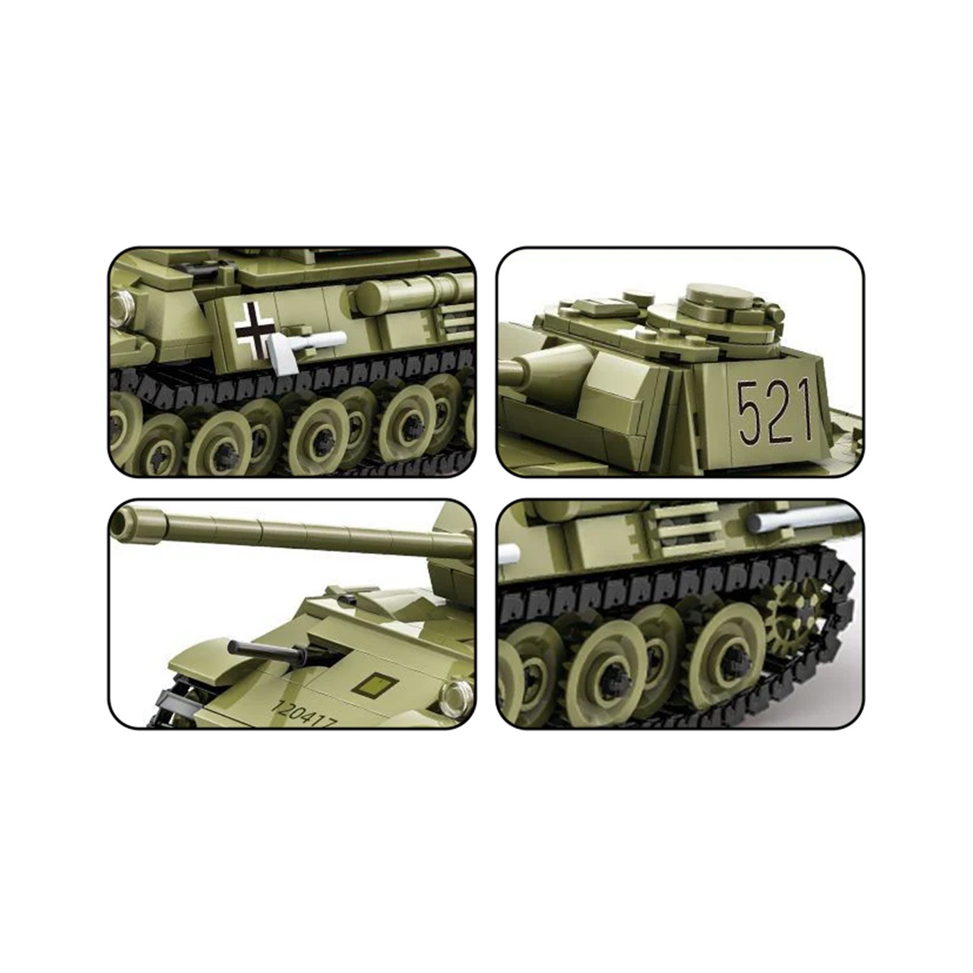Budowa obejmuje klasyczne elementy czołgu, takie jak gąsienice, wieżyczka oraz kadłub, co dodaje modelowi realistycznego charakteru. Całość jest trwała, dzięki czemu może być wielokrotnie składana i rozkładana bez utraty funkcjonalności.