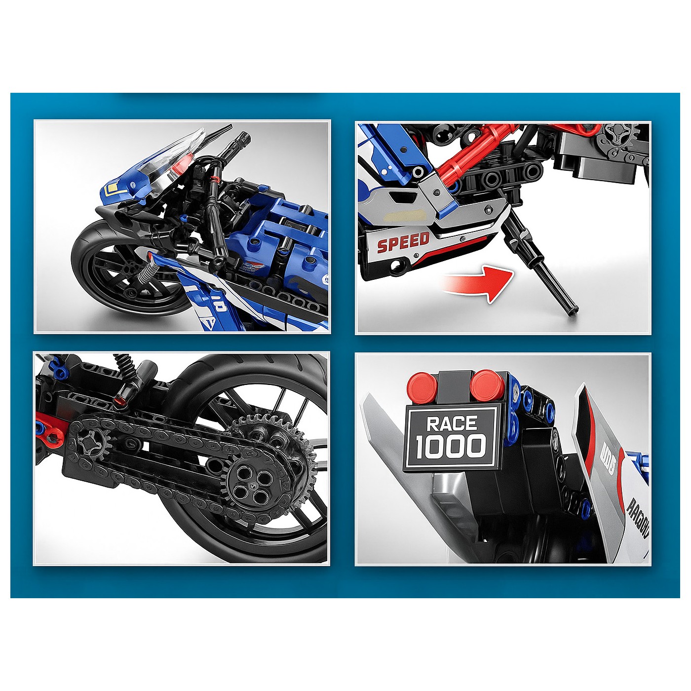 W zestawie znajduje się 426 elementów wykonanych z trwałego tworzywa sztucznego. Wszystkie części zostały zaprojektowane tak, by umożliwić dokładne i stabilne łączenie. Ułożony motocykl wyposażono w gumowe opony oraz składany podnóżek, który pozwala ustawić model w pozycji stojącej. Konstrukcja jest solidna i odporna na intensywne użytkowanie, a dzięki realistycznym proporcjom stanowi atrakcyjną bazę do dalszej zabawy lub ekspozycji.