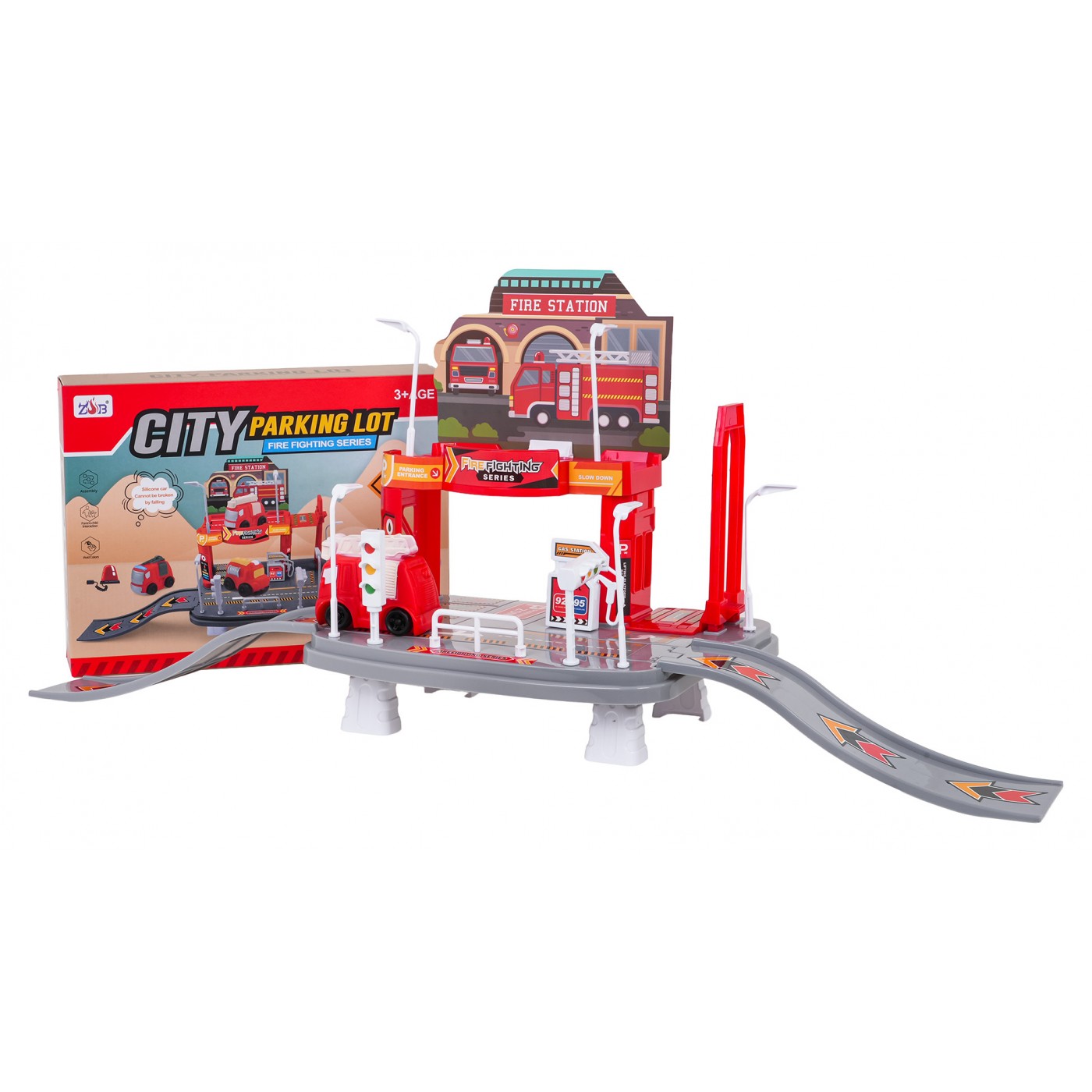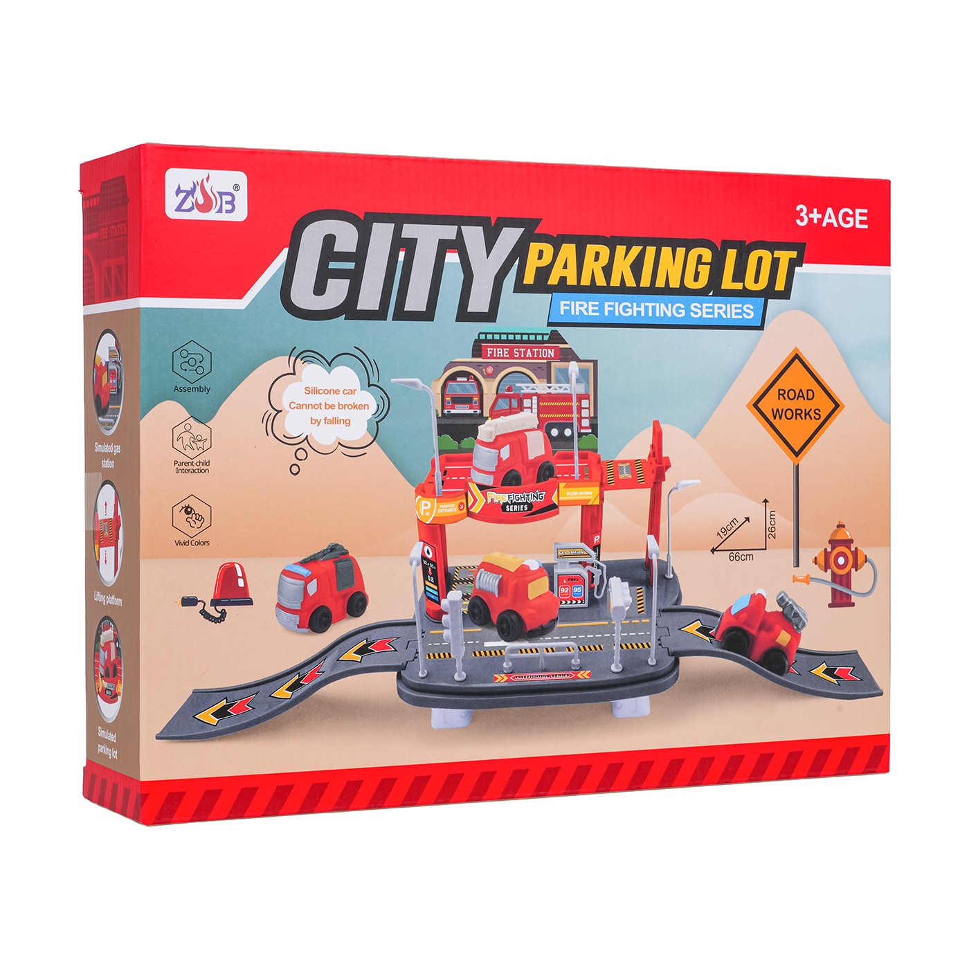 Zestaw zawiera silikonowy samochód strażacki z ruchomymi kółkami, który doskonale sprawdza się podczas jazdy po dołączonych drogach. Na górnym poziomie znajduje się miejsce postojowe z dostępem do ręcznie obsługiwanej windy, prowadzącej na parter. Dolna część parkingu zawiera stację paliw, znaki drogowe, drogi dojazdowe oraz wjazd i wyjazd w formie zjeżdżalni. Wszystkie elementy wykonano z wysokiej jakości materiałów, a po złożeniu konstrukcja zajmuje niewiele miejsca.
