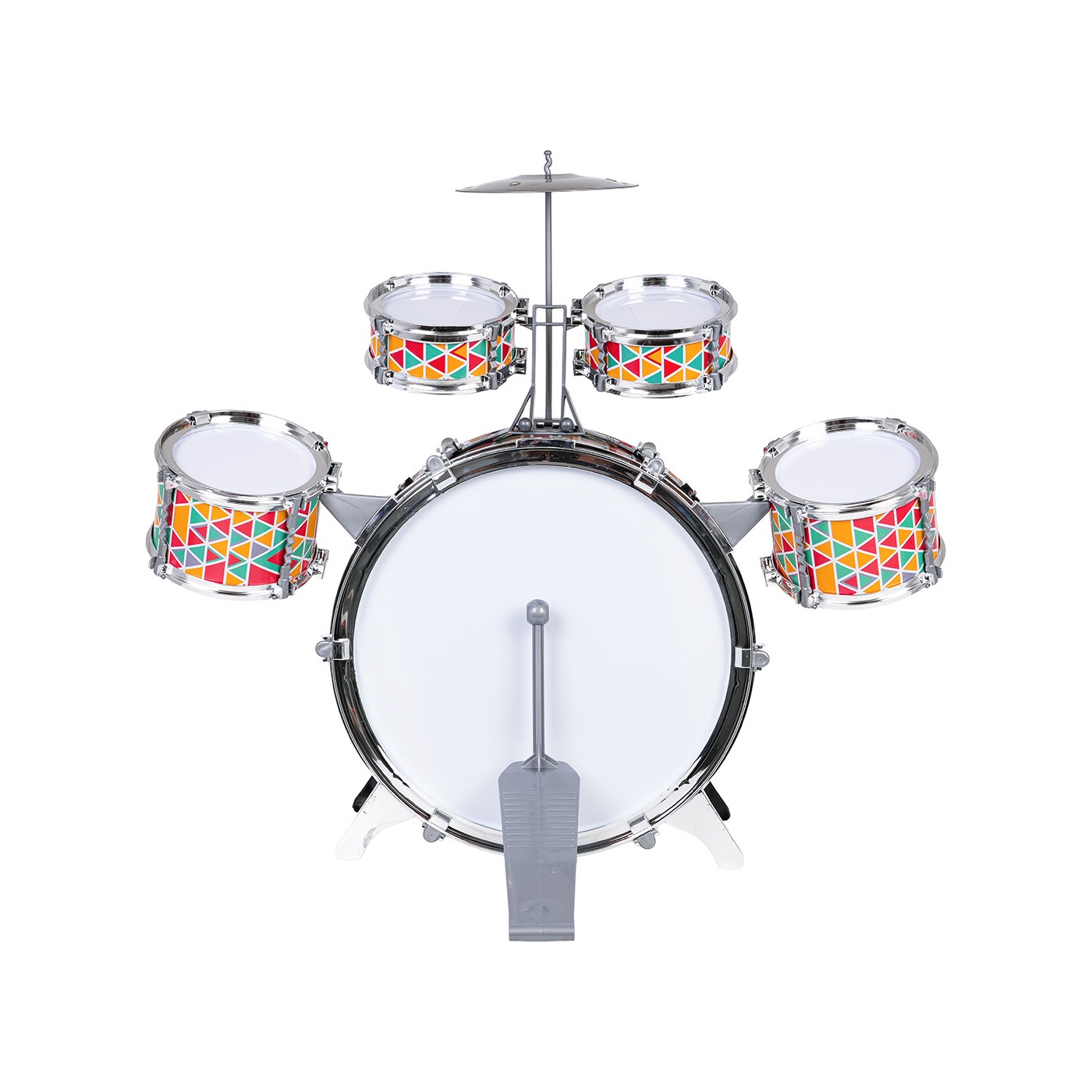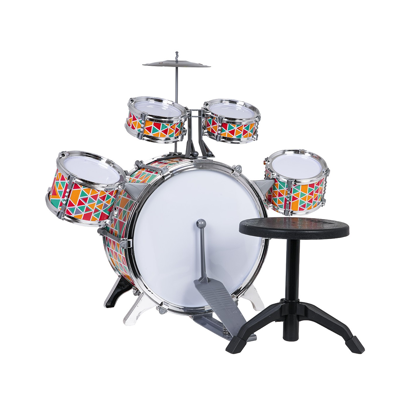 Każdy element zestawu został wykonany z bezpiecznych materiałów, dostosowanych do wieku dziecka. Perkusja posiada pięć bębnów o różnych rozmiarach oraz talerz wykonany z metalu, co pozwala na uzyskiwanie zróżnicowanych dźwięków. Do zestawu dołączone są pałeczki oraz wygodne krzesełko, które umożliwia komfortową grę. Konstrukcja jest lekka, stabilna i łatwa w montażu, dzięki czemu zestaw idealnie sprawdzi się zarówno w domu, jak i w przestrzeni edukacyjnej.