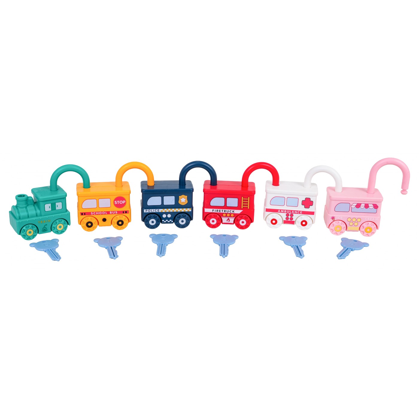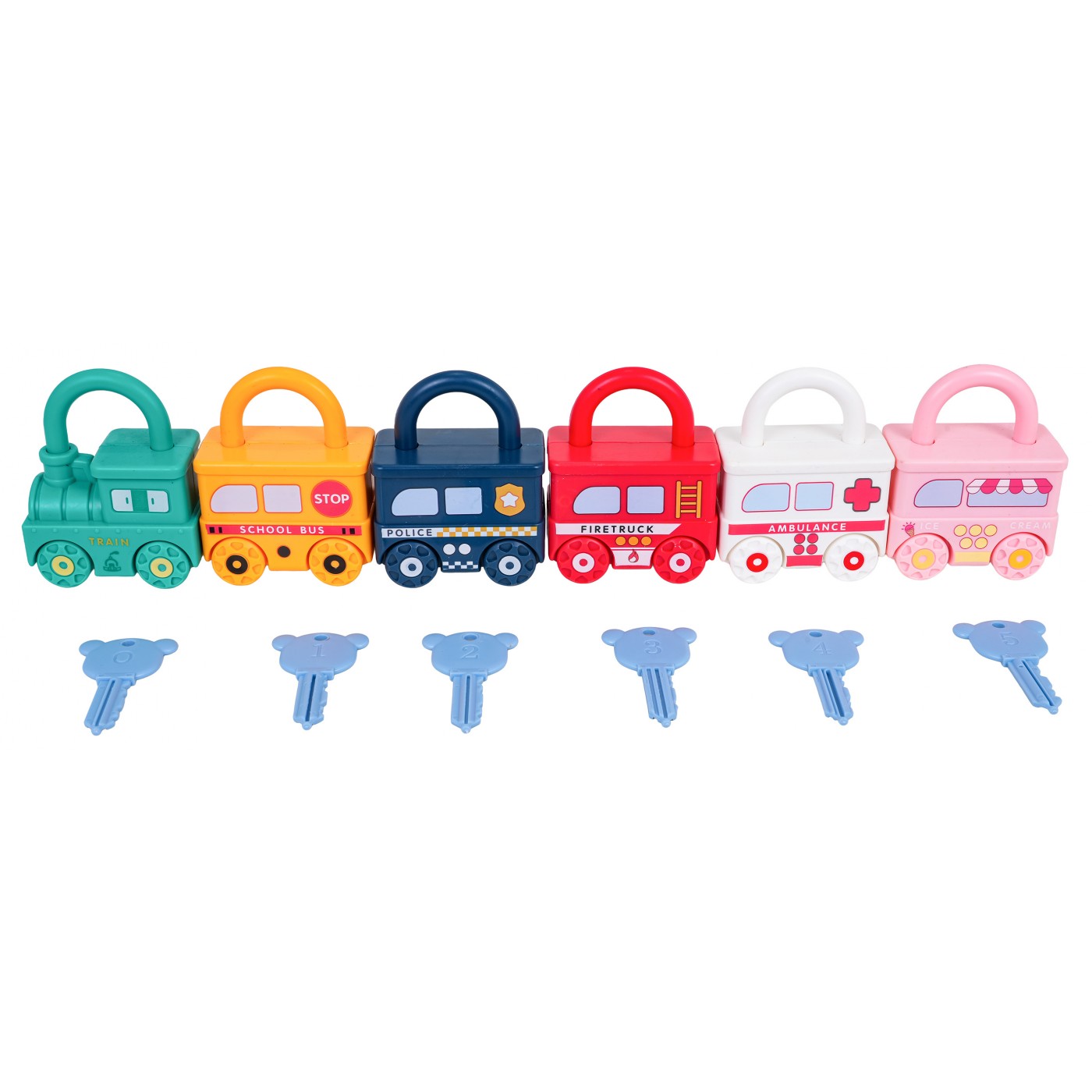 W komplecie znajduje się 7 kluczy, z których jeden jest uniwersalny, a pozostałe przypisane są do konkretnych kłódek. Dzięki temu dziecko może ćwiczyć dopasowywanie i rozpoznawanie cyfr. Górna część każdej kłódki po otwarciu obraca się o 360 stopni, co umożliwia łączenie pojazdów w jeden, kolorowy pociąg.